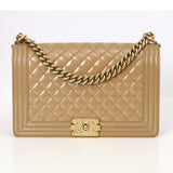 This pre-loved Chanel Nude Patent Leather New Medium Boy Bag embodies the house’s modern elegance and timeless charm. Crafted from lustrous nude patent leather, it features Chanel’s iconic quilted pattern and structured silhouette. The bag is accented with antique gold-tone hardware, including the Boy push-lock clasp and adjustable chain strap, offering versatile styling as a shoulder or crossbody bag. A sophisticated and contemporary piece that effortlessly elevates any look.