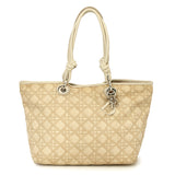 This tote features a neutral canvas with the iconic Cannage pattern, complemented by silver-tone hardware and dual shoulder straps. Leather trim embellishments and a spacious interior with three pockets make it both stylish and functional.