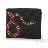 Shop Pre-Loved Gucci Kingsnake Print Bi-Fold Wallet, a striking and stylish accessory crafted in leather in a classic black monogram base. The wallet is adorned with Gucci’s iconic red, blue, and white Kingsnake design, adding a bold, eye-catching statement.