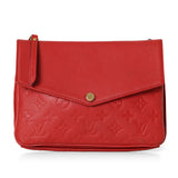 Shop Pre-Loved Louis Vuitton Twice Bag in red Monogram Empreinte leather, featuring the iconic LV embossed pattern with elegant gold-tone hardware. The bag has a flap closure with magnetic snaps and an adjustable chain strap for shoulder or crossbody wear. The interior includes multiple compartments for organization, combining practicality with style. Structured yet lightweight, this Louis Vuitton bag is perfect for day-to-night occasions, showcasing timeless luxury and craftsmanship.