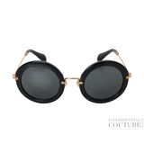 Shop Pre-Loved Miu Miu Black Donna Sole Round Sunglasses, with black lenses combined with a matching black round-shaped frame to create a sleek, timeless look. The arms are refined with a subtle touch of elegance, detailed in a combination of gold-tone and black. These sunglasses are lightweight and stylish in metal, versatile to style however you like, reflecting the signature luxury feel of Miu Miu.