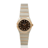 Shop Pre-loved Omega Constellation 25MM watch featuring a stainless steel case with elegant gold accents throughout. The black dial is adorned with sparkling diamond hour markers, while the bezel surrounding the dial is fully set with diamonds on gold, creating a luxurious and eye-catching effect. This sophisticated timepiece blends classic Omega design with refined two-tone elegance, making it perfect for both formal occasions and everyday luxury.