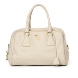 Shop Preloved Prada Vitello Daino Talco Leather Bauletto Bag BL0804 in a soft talco tone. Crafted from supple Vitello Daino leather, this elegant bauletto silhouette is accented with polished gold-tone hardware and subtle Prada logo detailing. The structured shape offers effortless sophistication while the spacious interior provides practical organization for everyday essentials, making it a timeless addition to any luxury collection.